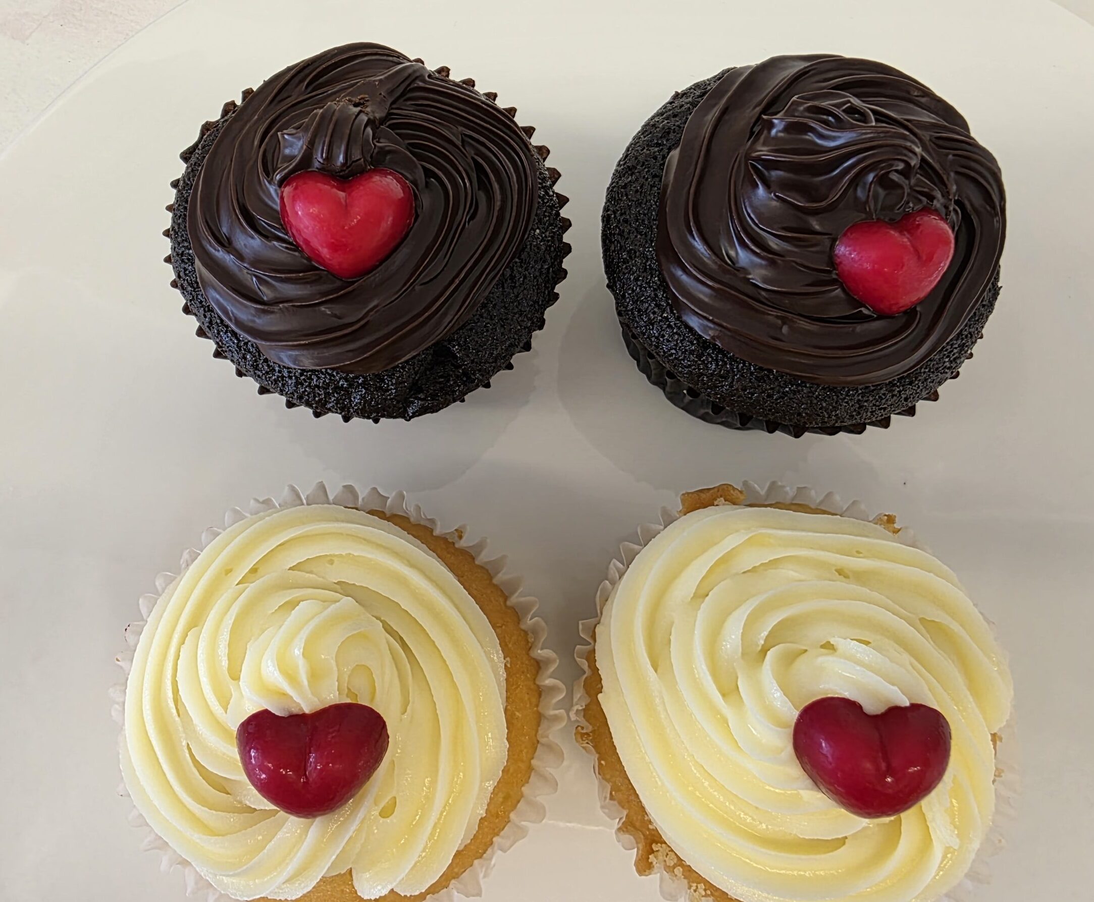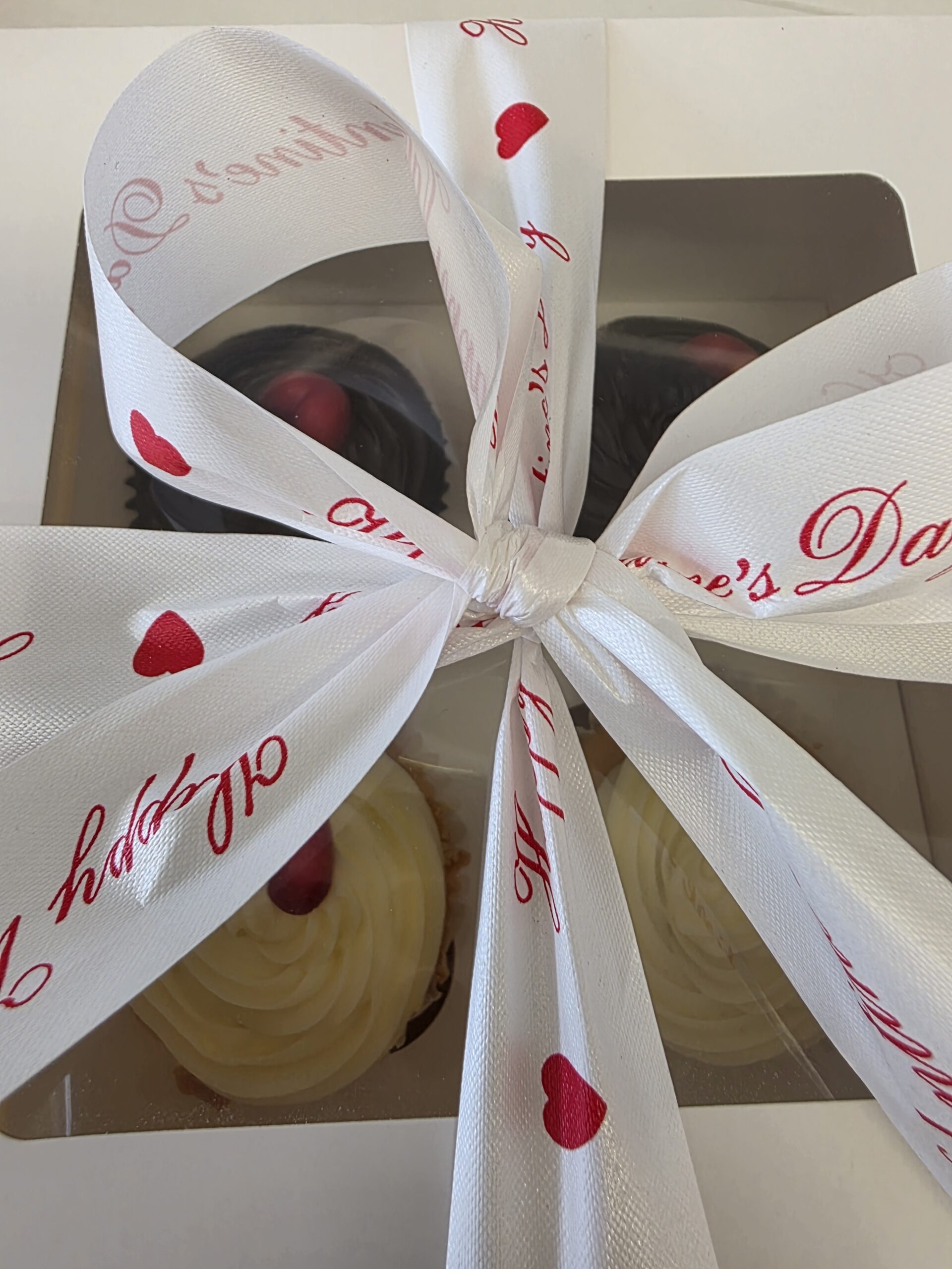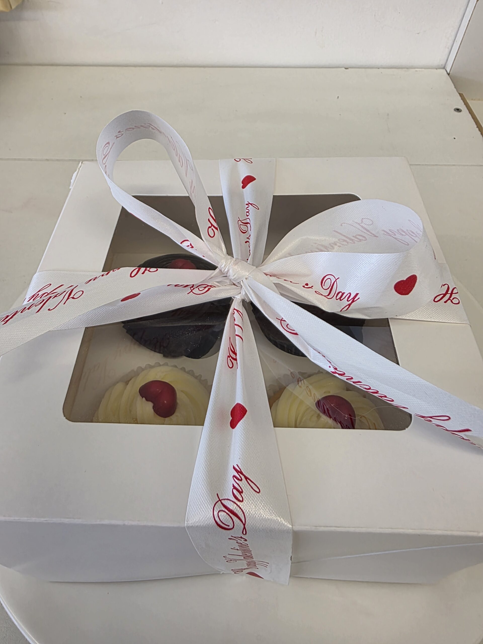 Choose from Chocolate, Red Velvet or Lemon Cup Cakes with Chocolate or Cream Cheese Icing and decorated with a White Chocolate Red Heart, boxed and tied with Valentines ribbon.